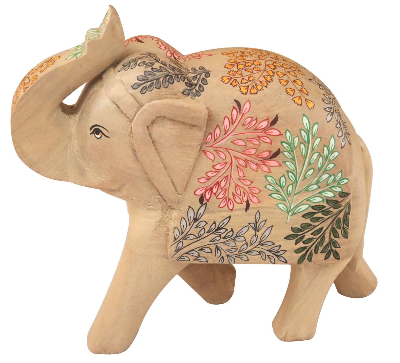 A beautifully handcrafted wooden elephant, said to be lucky with their trunk up, covered in an incredible hand painted leaf design. This kind of quality can't be mass-produced it's tediously done with great precision and made to stand out.