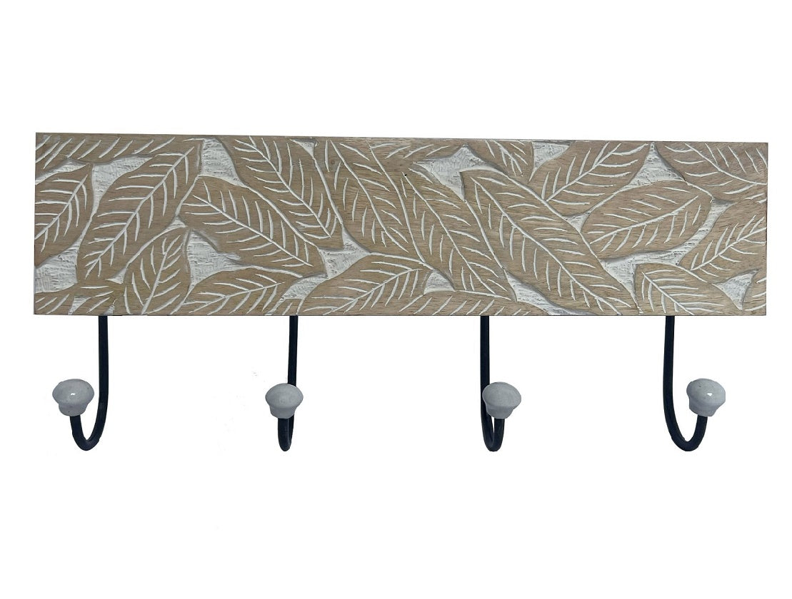 Natural Wooden 4 Wall Hook with Hand Carved Leaves